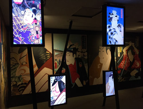 歌舞伎の役者絵や舞台のシーンなどの浮世絵を用いて、芝居小屋の雰囲気などを再現しているコーナーもありました。