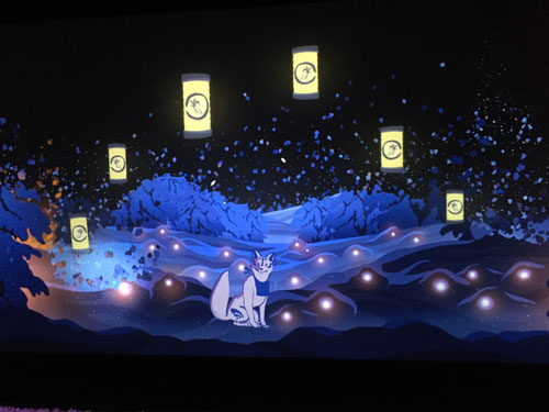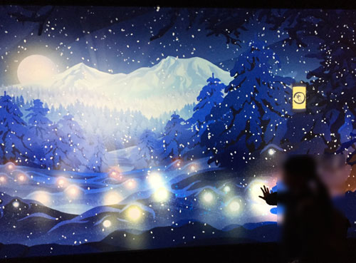 このスクリーンに手をかざすことで、狐を見つけるだけでなく、植物が芽吹いたり、提灯にあかりが灯ったりと映像が変化していくんですよ。