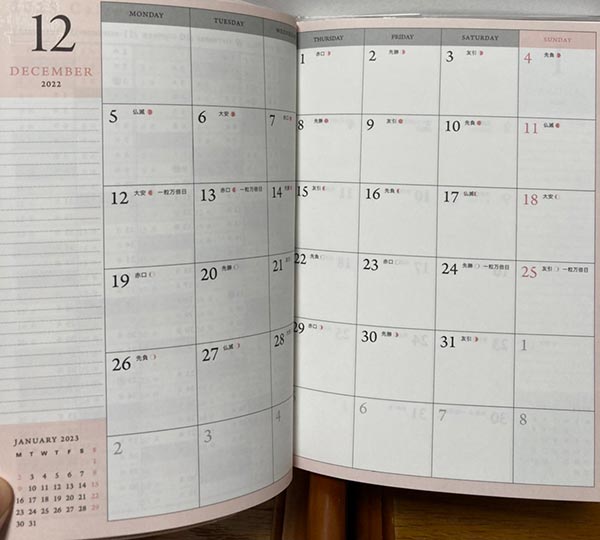 - 2022年12月~2024年1月まで各月間スケジュール。月ごとの見開き14ヶ月分。